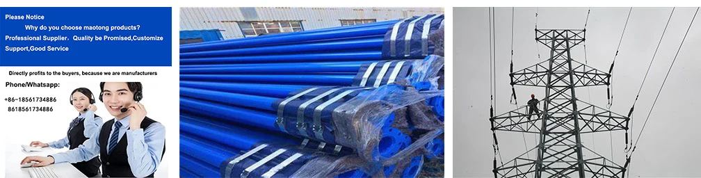 Angle Steel 330KV High Voltage Electric Transmission Towerin Maotong Company -pylväsmateriaali on saumaton teräsputki, jolla on pieni tuulikuormituskerroin, mutta vahva tuulenvastus. Käytännöllinen ulkolaippa kytketty torni, pultin vetolujuus on vahva, ei ole helppo vahingoittaa, sen ylläpitokustannukset ovat huomattavasti pienemmät.